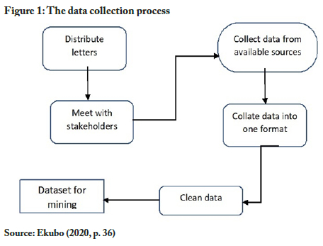 Figure 1 shows the complete data collection process followed in this study. The process involved letters being distributed to key stakeholders for permission to obtain data, which led to a meeting with stakeholders to agree on terms regarding the data-collection process and privacy issues. The next steps were the collection and collation of existing data from the available sources into one format, cleaning data to rid it of inaccurate or incomplete information, and preparation of the data for mining.