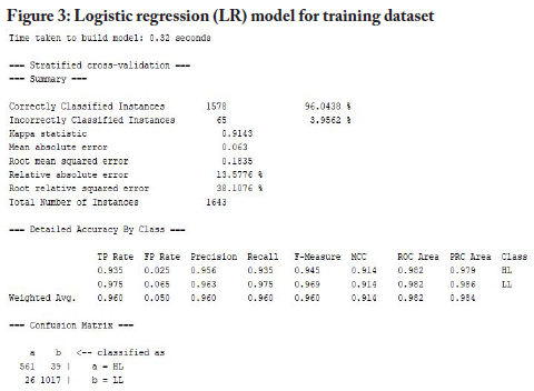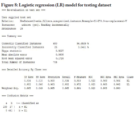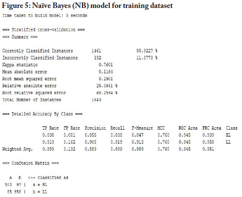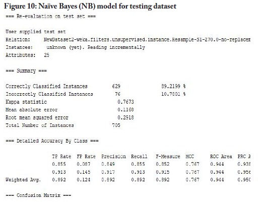 For the modelling process, the study used the WEKA tool to build models with the training dataset for the five selected machine-learning algorithms, namely J48 decision tree, LR, MLP, NB and SMO. Figures 2 to 6 below provide snapshots of the results from the modelling processes.
