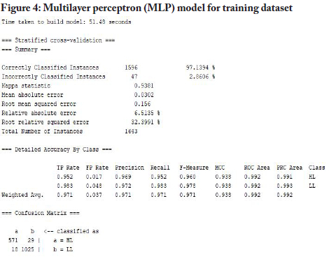 Table 2 compares the performance of the classifier models based on correctly and incorrectly classified student data for the training dataset. The acronyms "LL" and "HL" in the table stand for "LowLow" and "HighLow", which were this study's two hyperparameters, i.e., parameters whose values controlled the learning process. Each machine-learning model had to deliver either an LL or HL classification for each student record. The focus in this study was on classifying low-performing students into two groups-HL and LL-with the idea being that students in the LL group would be the ones to receive urgent assistance to improve their chances of performing well. As seen in the table, the MLP algorithm correctly classified the highest number of students (1,596) for the entire training dataset and misclassified the lowest number of students (47). SMO had the next best performance, with 1,580 records classified correctly and 63 misclassifications. LR followed SMO with a classification margin of two less than SMO: 1,578 records were correctly classified, and 65 records were incorrectly classified. J48 correctly classified 1,566 student records and misclassified 77 records. NB showed the poorest performance, with 1,461 correctly classified records and 182 misclassified records.