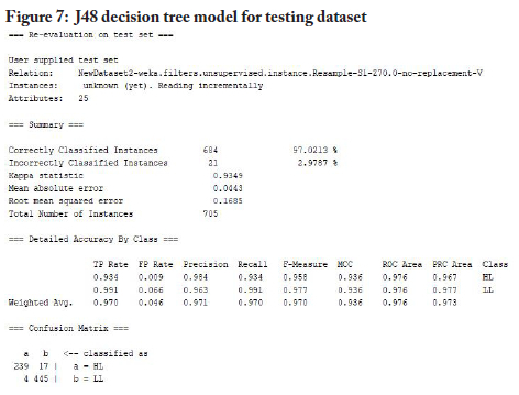 After successful modelling of the training dataset, the study used the testing dataset to test the models built to confirm how well each built model performed with the unseen dataset. Figures 7 to 11 are snapshots of the results from this process.