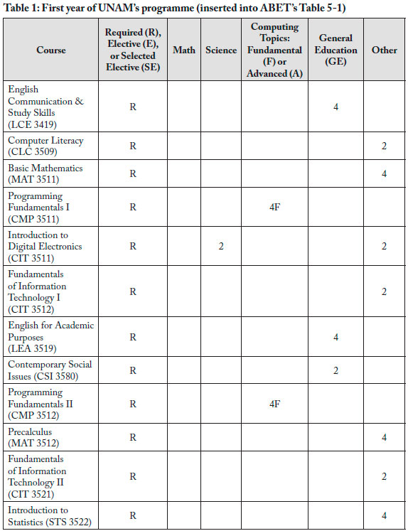 A key part of ABET's Self-Study Report procedures is "Table 5-1", which is where programmes must describe their curricula (ABET, 2022d). Accordingly, Tables 1 to 4 below represent our mapping of UNAM's programme in the ABET Table 5-1 format, with each table corresponding to a year of study. We scaled UNAM's courses from 16 credits to four credits, which we regard as equivalents across the Namibian and US credit frameworks. And it should be noted that in the UNAM programme each full course has four contact hours per week and an associated practical session of three additional hours per week. Half-courses have four contact hours per week and practical sessions of 1.5 hours per week. The numbers in the columns represent the number of credits assigned to a given course, in the ABET accounting system. For example, Introduction to Digital Electronics (CIT 3511) has two credits of science and two credits of "other".