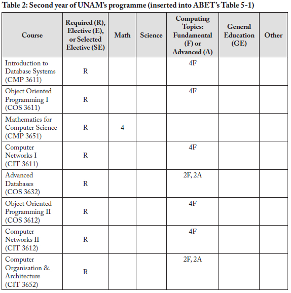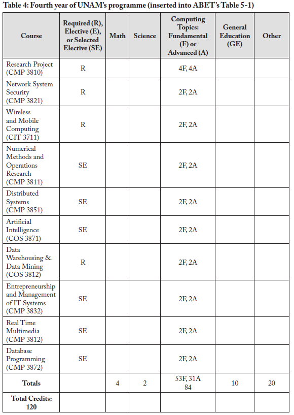 ABET requires at least 15 credit hours of mathematics that must include discrete mathematics and must have mathematical rigor at least equivalent to introductory calculus. Table 4 shows that the UNAM programme only has four credits of mathematics-i.e., the four-credit Mathematics for Computer Science (CMP 3651) course-with a rigor equivalent to introductory calculus (s8).