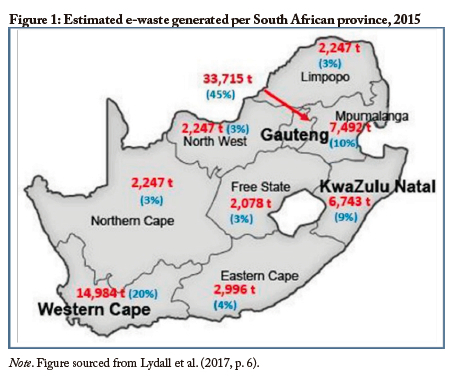South Africans' use of technology has grown significantly in recent decades (Stats SA, 2019), thus increasing the amounts of e-waste generated. According to Ludek (2024), 360,000 tonnes of e-waste are generated in the country each year; only around 12% is reclyced, with the rest dumped in landfills. Figure 1 below provides 2015 estimates for the amount of e-waste generated by each of South Africa's nine provinces.