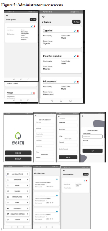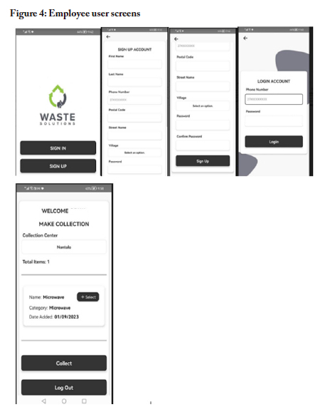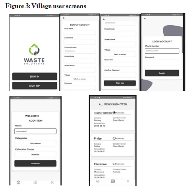 The app uses English as a communication medium. One reason for this was that participants stated that they were using this as a learning opportunity; they wanted to use this app to help them learn how to use other apps, and the majority of apps use English. Another reason that they gave was that, should the app be successful in terms of adoption and rollout to other places, this would put the two villages on the map as the ones to have successfully built an e-waste app now being used by other places. The participants stated that they wanted to make history, and having the app in English would help with that objective. Below are screenshots of the interfaces developed for the three user categories.