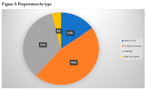 Figure 3 presents the percentage distribution of the perpetrator types, with cybercriminals (46%) and hackers (35%) being the most common perpetrators, followed by hacktivists (15%) and nation states (4%).