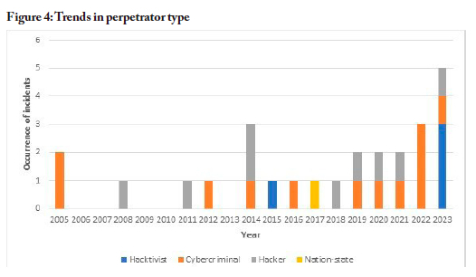 Figure 4 shows the trends in perpetrator type, indicating that cybercriminals and hackers were generally active across the years of study, with a stronger presence from 2018 to 2023. The year 2023 witnessed an abrupt emergence of incidents related to hacktivists, whose actions were closely related to the strained political situation in the country. Meanwhile, only one incident was attributed to a nation-state actor.