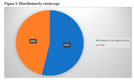Figure 5 depicts the distribution of victim types as state/political entities or other. Attacks targeting state/political entities are more prevalent than those targeting other entities.