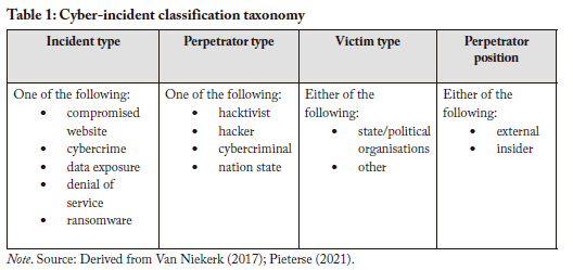 To analyse the gathered data on the 26 cyber incidents, I used the three classifications established by Van Niekerk (2017) and Pieterse (2021): incident type, perpetrator type, and victim type. I also added a fourth classification: perpetrator position. Table 1 summarises the elements in each classification.