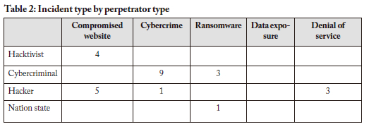 Table 2 is a pivot table that links the incident types to the perpetrator types. As expected, there is a strong correlation between cybercrime and cybercriminal actors, followed by a strong association between hackers and compromised websites, and between hacktivists and compromised websites.