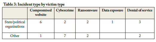 Table 3 is a pivot table that associates incident types with victim types. It shows that the most frequent incident type for state/political organisations was a compromised website, while the most frequent incident type for non-state/political organisations was cybercrime.