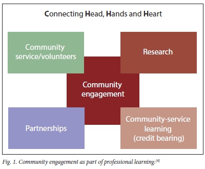 Challenges in this context require thoughtful curriculum development. One such response is illustrated by the postgraduate diploma in child psychiatric nursing that was developed by a university in response to the mental health needs of children in SA.[3] A family-centred focus in the programme underscores both theory and practice.[3] Therefore, a service-learning and community-engagement approach is integrated in the child psychiatric nursing curriculum by means of frequent outreach programmes to the community. Community engagement is an integral and core part of higher education and health education in SA, and it rests upon four pillars (Fig. 1).