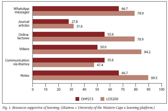Participants comprised oral hygiene students in their second year of study (OHP213: n=29; LOS200: n=32), clinical chairside teachers (n=2) and lecturers (n=3) of the two modules. Data were generated from: (i) student evaluation of modules; (ii) documents, including assessments such as tests and assignments, learning activities and clinical procedures; (iii) reports of an internal teaching and learning specialist (Faculty of Dentistry) and external subject specialists (academics from two dental schools in SA); and (iv) lecturer/clinical teacher feedback. A modified version of the faculty module evaluation questionnaire, guided by the literature on the effects of the COVID-19 pandemic, was used for students. This questionnaire, using Google Forms, was self-administered and anonymous and included open-ended and closed-ended questions. The questionnaire comprised 4 sections, which included demographic information and student perceptions and opinions of teaching, learning and assessments within the context of the COVID-19 pandemic. Students could respond to a range of statements on a 5-point scale, ranging from strongly agree, agree, neutral, disagree to strongly disagree, to elicit their perception of teaching and learning (Table 2). In addition, they could identify their access to resources and factors impacting on their learning from a predefined list (Figs 1 - 3). Open-ended questions included their challenges, suggestions and reflections. Records of teaching, learning and assessment, as well as faculty protocols, were used as data on student performance. The teaching and learning specialist was requested to review these and provide a report on the alignment of modules in terms of outcomes, content, assessment and teaching practice, while the content specialists reported on theoretical and practical content and teaching application relevant to each module. A modified version of the ERTE framework[10] was used to generate data on lecturers' perceptions and experiences of their modules. Two iterations were done. The three lecturers individually recorded a self-reflection on 'affordances and challenges' presented and experienced during this period, which was then shared. These recordings informed the topics for the focus group discussion and a second iteration facilitated by a colleague acquainted with teaching and learning pedagogy, and allowed for deeper exploration of the themes. Quantitative data were described and presented as frequency tables.