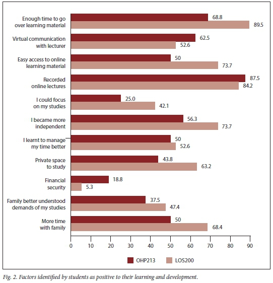 In the open-ended questions, students were asked to identify the most significant change in their lives during lockdown. These were themed as: (i) personal such as time management, being more productive and organised, compromising on how the day was organised, being more disciplined, self-motivated and adapting to new ways; (ii) the home such as changes such as juggling household duties, not having to travel and being indoors most of the time; and (iii) learning such as adapting to a new norm of studying online, not going to university, not being able to interact with lecturers and peers, being dependent on technology, online assessments and insufficient practical experience: