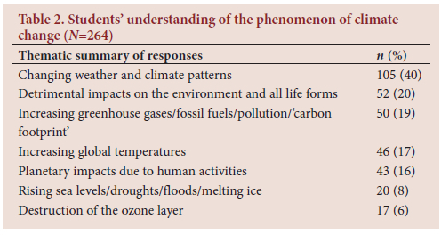 OBJECTIVES. To assess the knowledge, perceptions and understanding of climate change and environmental sustainability among undergraduate health sciences students at the Faculty of Health Sciences (FHS), University of Cape Town (UCT).