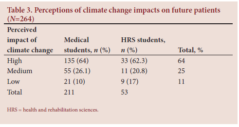 Most thought that health is impacted by climate change due to natural disasters or extreme weather events (94.7%; n=250), air quality-related illnesses (92.4%; n=44), water-borne diseases (91.7%; n=250), malnutrition (81.4%; n=215), vector-borne diseases (76.9%; n=203), mental illnesses (65.5%; n=173) and heat-related illnesses (28.0%; n=74). Two-thirds (64.0%; n=168) thought that climate change will have a high impact on the health, quality of life or environment of their future patients, due to factors such as the quality of the air, food and water (Table 3). Those who thought that the impacts will be of medium severity (25%; n=66), also believed that climate change is still reversible or less extreme in SA than elsewhere, or that climate-health impacts are not apparent. Others who thought that the impacts will be low (11%; n=30), believed that their generation would not be affected, that social factors in SA are more important determinants of health than climate change, or they were unaware of any climate-health impacts.