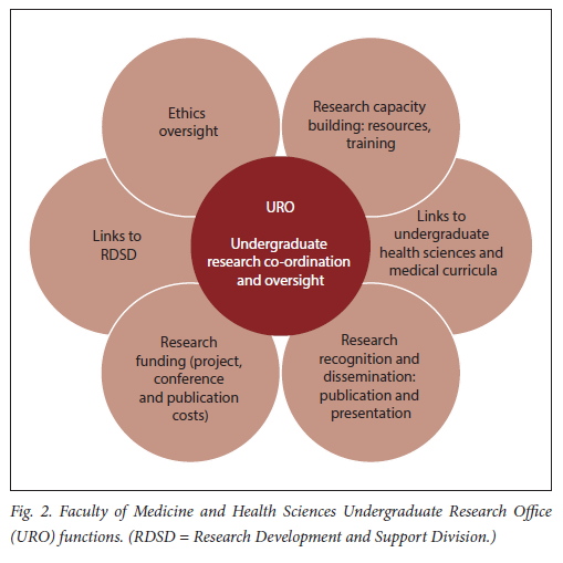 The URO head also conducted desktop research on and networked with undergraduate research support at all other medical faculties in SA to benchmark how research was - or was not - incorporated into medical curricula. Based on this situational analysis, URO focused on three core functions (research capacity-building; ethics review; funding) and two support functions (co-ordination/oversight; awareness-raising/showcasing). To the best of our knowledge, URO is the first and currently only central structure dedicated to supporting undergraduate research at a faculty of medicine and health sciences in SA.