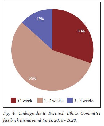 The establishment of UREC has been described above. Since its first review cycle in October 2015, UREC has reviewed 243 undergraduate and Honours ethics applications: 2016 (includes October 2015 applications): 44; 2017: 55; 2018: 39; 2019: 53; and 2020: 52. Fig. 3 shows the percentage of UREC applications received per degree programme. The majority came from MB ChB (40%), Honours (28%) and occupational therapy (20%) students. Physiotherapy students conduct systematic reviews (no ethics review); dietetics students usually participate in a larger departmental research project with a single ethics application.