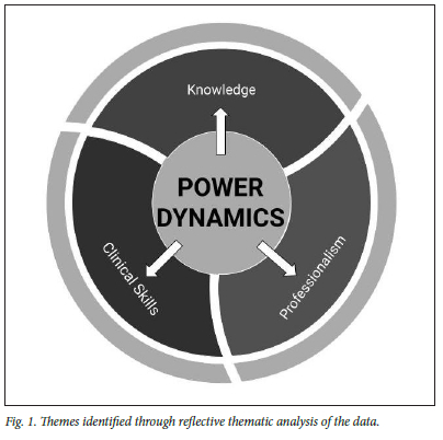 The central and novel theme identified from the three sources of data was power dynamics, as it interacted with and impacted on other identified themes, i.e. knowledge, clinical skills and professionalism. Fig. 1 illustrates the centrality of the theme of power dynamics and how the other themes are impacted by it.