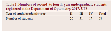 Sample selection was applied for the questionnaire survey and focus group interviews. For the questionnaire survey, the study population included all students enrolled in their second, third and fourth year (Table 1) in the undergraduate optometry programme during 2017 (N=68).
