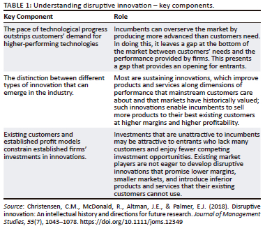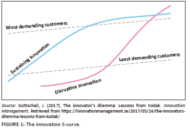 To understand why organisations fail in the face of technological change, Tushman and Anderson (1986) argue that failure happens when the new technology destroys the competence of the existing players instead of enhancing it. Christensen et al.'s (2018) theory of disruptive innovation identifies key components that play an instrumental role in understanding disruptive innovation (see Table 1). Christensen's initial idea was that overreliance on existing customers and assuming their continuing needs could be dangerous when a new technology disrupts the market (Kilkkia et al., 2017). While firms may manage to renew their competencies, they often struggle when innovations enabled by the new technology are not immediately demanded by existing customers (Sandstrom et al., 2014). The innovation may initially appeal only to a small (and often not very profitable) customer sector, while established organisations are more focused on servicing the more stable, high-end market. Although the new entrant might bring to market more advanced technologies, the broader mainstream market segments still support established service providers. Therefore, the value of disruptive innovation to the mainstream market is not high and sits at the bottom of the S-curve. Once disruptive innovation gains traction in the mainstream market, established companies pick up on the new technology and respond to it. However, this is often too late because the new technology is on the exponential part of the S-curve as seen in Figure 1. It becomes difficult for the existing market players to catch up as the product development required to bridge the gap takes time. Foster (1986) advises that as technologies start to change along the S-curves, existing market players might fail if they are not effective at switching to a newer technology that surpasses the new market players' technology in performance.