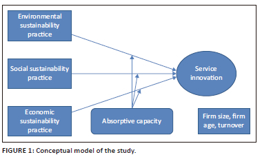 By ensuring that societal needs and well-being are met, organisations stand the chance to give insights into the pertinent societal issues affecting communities (Enquist et al., 2015). Having insights into challenges to these challenges offer organisations the leverage to design and implement social service innovation programmes. The integration and deliberate partnership between firm and community can enrich the co-creation and co-innovation process of firms. In addition, their interactions provide legitimate grounds for the acceptance of a firm's services (Cocca & Ganz, 2015). Offering green services can provide some form of economic gains to organisations (Cocca & Ganz, 2015); however, to offer green services businesses should have initiated sustainability practices over a period. The practice of corporate sustainability opens up organisations to new markets and opportunities. The birth of sustainability practices has opened entirely new green markets. Exploring these markets promises significant economic returns to firms - offering green services enables firms to attract and retain a new distinct group of customers. The practice of economic sustainability practice ultimately would affect the service innovation outcome of businesses (Lin & Chen, 2018). Summarily, the dimensions of corporate sustainability when practiced holistically have the potential to impact the service innovation outcome and performance of service enterprises. Environmental sustainability practices, social sustainability practices and economic sustainability practices are argued to influence the service innovation of service firms as a whole and in their various dimensions. Based on the given theory, hypotheses 1-3 are formulated: