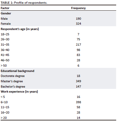 The study utilised a sample of 514 respondents selected from diverse organisations. These informants are knowledgeable and have enough experience in the practice of business sustainability and organisational innovation processes across different industries. Respondent demonstrated an appreciable amount of knowledge on the subject. These respondents are selected from industrial sectors such as banking and finance (48% resulting in 246 respondents); insurance (14% translating into 72 respondents); Professional service firms (32% translating into 164 respondents); healthcare (6% translating into 32 respondents). The profile information of respondents is presented in Table 1.