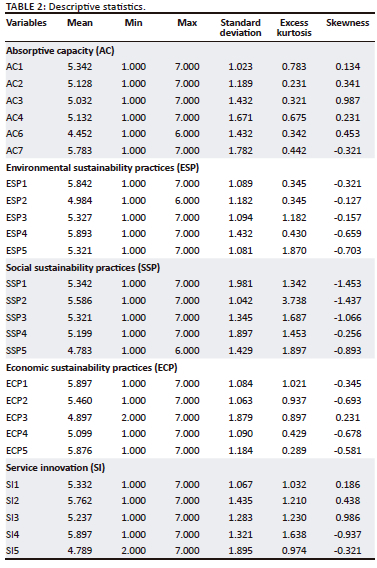 Green oriented service innovation (SI) is measured using adapted scale developed by Chen et al., 2011. The measurement of green SI consists of five items. For example, (1) the firm repackages existing services based on its environmental concerns; (2) the firm proposes new practices in the promotion of new services to improve environmental reputation and (3) the firm offers new customer service based on social and environmental concern of stakeholders. The reliability score for SI is 0.885.