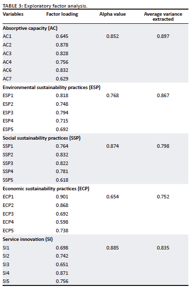 The environmental business sustainability practises measures included five items adapted from a study by Adebambo et al. (2015) and utilised in a study by Frempong et al. (2021). Examples include the following: (1) my organisation recognises environmental sustainability practises as critical to success in the green economy; (2) our organisation deliberately implements measures to promote the offering of environmental products and services; and (3) our firm prefers to work with partners and organisations that have environmental certification. The reliability of ESP items in this research is 0.768.