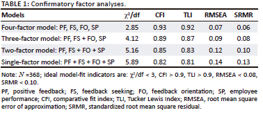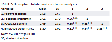 Table 2 presents descriptive statistics and correlation analysis results of positive feedback, feedback orientation, feedback seeking and employee performance. As shown, positive supervisor feedback was positively related to feedback seeking (r = 0.50, p < 0.001) and employee performance (r = 0.31, p < 0.001). Besides, feedback seeking was also positively related to employee performance (r = 0.33, p < 0.001). Therefore, these findings preliminarily support the hypothesis of the current study.