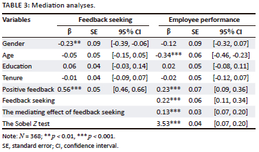 As presented in Table 3, after controlling for gender, age, education and tenure, positive feedback positively predicted feedback seeking (β = 0.56, p < 0.001, 95% CI = [0.46, 0.66]), and feedback seeking positively predicted employee performance (β = 0.22, p < 0.001, 95% CI = [0.11, 0.34]). Meanwhile, the direct effect of positive feedback on employee performance was also significant (β = 0.23, p < 0.001, 95% CI = [0.09, 0.63]). In addition, the mediating effect of feedback seeking was 0.13 (p < 0.001, 95% CI = [0.07, 0.20]), and the results of the Sobel Z test showed that the indirect effect of positive feedback on employee performance via feedback seeking was also significant (Z = 3.53, p < 0.001, 95% CI = [0.07, 0.20]). Therefore, Hypothesis 1 and Hypothesis 2 were supported.