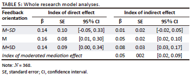In order to test all the proposed hypotheses and theoretical model, the Bootstrapping analysing method was applied via the PROCESS macro in SPSS 22.0 (Preacher & Hayes, 2008) in this study, and 5000 bootstrap samples were used according to the analytical procedure proposed by Cole et al. (2008). To be specific, for the direct influence of positive feedback on employee performance and the mediating effect of feedback seeking, namely Hypothesis 1 and Hypothesis 2, the Model 4 of PROCESS macro was firstly used to test both. The results are presented in Table 3. Secondly, in order to test the moderating role of feedback orientation, Model 1 of PROCESS macro was introduced to check Hypothesis 3 and Hypothesis 4. The results are presented in Table 4. Finally, this study employed Model 8 of PROCESS macro to test the whole theoretical model, and the results are presented in Table 5.