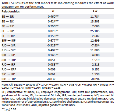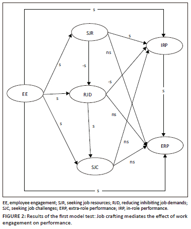 The results of the first model test show that the three forms of JC have a significant positive effect on EE. This study also proved that EE increases IRP and ERP. Reducing inhibiting JDs has a negative and positive effect on SJR and SJC. The first model also proved that the three JC dimensions increase IRP and ERP. In other words, EE fully mediated the effect of the three JC dimensions on both performance dimensions.