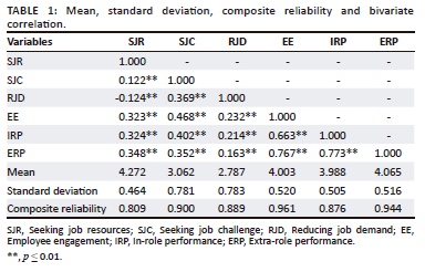 Preliminary analyses reporting the mean, standard deviation, bivariate correlation between variables and composite reliability are shown in Table 1. The mean of the studied variables is moderate (SJC and RJD) and high (SJR, EE, IRP and ERP). Seeking job challenge and RJD are high, while the other variables have a moderate standard deviation.