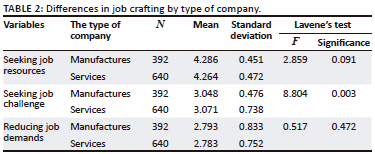 This study partially supports the research findings of Rudolph et al. (2017) and Wrzesniewski et al. (2013), which state differences in JC between manufacturing and service companies. In addition, SJC differed between the two types of companies, while SJR and RJD had no difference. Manufacturing companies have a consistent work rhythm; hence, employees do not try to look for challenges, while those in service companies require a lot of creativity. This study supports the TWA, which states that work is an interaction between employees and their environment (Hulshof et al., 2020).