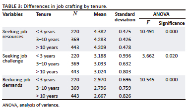 Table 2 shows that only SJC differs between manufacturing and service MSMEs. The other variables did not obtain any difference. In other words, different types of work lead to different challenges. Furthermore, Table 3 presents the results of the analysis of variance (ANOVA) test for testing the differences in the three JC dimensions based on tenure. Table 3 shows differences in the three JC dimensions in terms of employee tenure. The average SJR, SJC and RJD decreased following the significant difference.