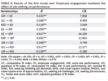 Previous studies found that EE mediates the effect of JC on performance (Metin et al., 2018; Park et al., 2020; Tims et al., 2013), IRP (Dubbelt et al., 2019) and ERP (Demerouti et al., 2015; Vogel et al., 2016). However, the research results of Van Wingerden et al. (2017) found that EE partially mediated the influence of JC on performance. Seeking job resources and challenges can improve performance directly (Kooij et al., 2017; Petrou et al., 2015) and indirectly through EE (Bakker et al., 2012; Demerouti et al., 2015; Tims et al., 2015). Some studies found that long-term engagement encourages employees to redesign their jobs (Bakker et al., 2020; Gray et al., 2020; Inam et al., 2021).