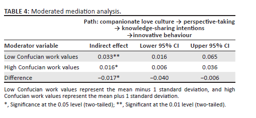 Next, this study used the coefficient product method proposed by Hayes (Hayes & Scharkow, 2013) to conduct moderated mediation analysis, which tests the significance of the interaction between the moderator and the mediator on the product of the path coefficients. Furthermore, the difference analysis method proposed by Edwards and Lambert (2007) was used to verify the moderated mediation effect by directly testing the significance of the difference between the two indirect effects, thus simultaneously testing the moderating effect of Confucian work values on the chain mediation effects of perspective-taking and knowledge-sharing intentions between the companionate love culture and employee innovative behaviour. The results of the analysis are as follows: in the chain mediation model from the companionate love culture through perspective-taking and knowledge-sharing intentions to employee innovative behaviour, the product of the path coefficients between the interaction term and the mediator (a3 × d1 × b2) was −0.016 (p < 0.01), indicating that the chain mediation effect was moderated by Confucian work values.