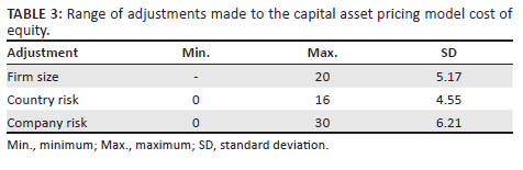 As can be seen in Table 3, the magnitude of the adjustments processed to the CAPM-derived cost of equity is also based on judgement. This may be considered acceptable as the adjustments are very likely to vary based on company-specific circumstances. However, the results of the survey indicated vast differences in the adjustments processed for each respective risk factor identified in the previous question.