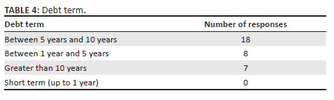 As discussed in the literature review, not all corporates have the privilege of having access to long-term finance from banks. The implication of this is that the long-term debt needs to be estimated assuming that there is a potential to raise this long-term debt. There are also not many actively traded corporate bonds locally. As a result, many practitioners use the cost of short-term debt as a proxy for the cost of long-term debt. This can be seen from the survey results in Table 4 where only 21% of the candidates utilise a debt term which is greater than 10 years.