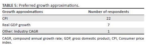 Respondents were asked what they consider an adequate proxy for long-term growth of a company's cash flows. As can be seen in Table 5, although there is a strong preference for the consumer price index, a fair number of respondents chose real GDP growth. The differences in the responses regarding an input as significant as the growth rate were noted for exploration in the interviews.
