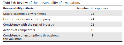 Respondents were asked how they examine the sensitivity and robustness of a firm's business plan. Table 6 shows that the most popular benchmarks were industry-specific, with a strong focus on the actions of competitors. The context in which subject companies operate was further emphasised by the focus on economic indicators as a reasonability indicator. Notably, the least common reasonability criterion was internal consistency of the valuation. The reasonability criteria are dominated by benchmarks that indicate the reasonability of the chosen assumptions, rather than how those assumptions have been applied.