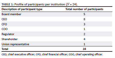 A qualitative (inductive) approach was followed to answer the research questions. The research strategy adopted encompasses the elements of a phenomenological research. Block (2014) states that phenomenology is a field of philosophy which studies people's views and experiences in relation to the phenomena. This is the case in this study as one-on-one, online video semi-structured interviews were conducted to enable the researcher to explore the respondents' perceptions, experiences, and attitudes on the leadership of the CEO. The target population in this research is the former and current CEOs, chief financial officers (CFOs), chief operating officers (COOs), board members, regulators, shareholders, and union representatives from the 21 SOEs classified as Schedule 2 in the PFMA in South Africa that had undergone turnaround in the past. The sampled participants have an insight into the role of the CEO in the turnaround of SOE in South Africa. In this research, it is not possible to reflect the exact size of the target population considering the nature of the respondents being former and current. The researcher conducted a total of 24 interviews (23 online and 1 face-to-face interviews). A list of participants is presented in Table 1.