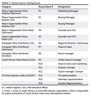 The population comprised all individuals working directly or indirectly within the wine industry in South Africa or in Europe with knowledge about South African wine and European markets. This included respondents working in European wine retailers and supermarkets, wine distribution businesses, wine marketing businesses, and South African wine brand owners, and industry bodies. We utilised a purposeful sampling strategy structured around the criterion that the selected respondents had the necessary expertise into the research problem and where they were likely to yield insight into the COO phenomenon. We focussed on three of the largest export markets for South African wine (the United Kingdom - ranked as the largest, Germany in second place, and Sweden in sixth place) (SAWIS, 2022). We then gathered data on the largest buyers of South African wine in these countries and ensured representation from the major supermarket purchasers, independent wine retailers, wine distributors, as well as industry representatives. Likewise, in South Africa we examined the export data to determine who the major South African wine exporters were and therewith drew up a list of participants. Our respondents therefore came from a variety of backgrounds within the wine industry as presented in Table 1. We conducted 15 interviews in total as data saturation became apparent at this point.