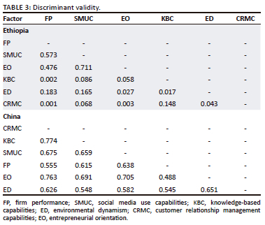 After preliminary data analysis in SPSS 24.0, EFA was run employing the principal axis factoring method (Fabrigar et al., 1999; Hair et al., 1998). The EFA results explain that three items of EO in Ethiopia (E04, E05 and EO6) and two items in China (EO1 and EO2), three items of KBCs in Ethiopia (KBC2, KBC4 and KBC6), three items of social media use in Ethiopia (SMUC6, SMUC7 and SMUC8) and one item in China (SMUC1), six items of customer relationship management in Ethiopia (CRMC2, CRMC3, CRMC4, CRMC5, CRMC6 and CRMC9), one item of EDs in Ethiopia (ED1), one item in China (ED1) and one item of FP in China (FP1) were removed because they could not meet the threshold criteria (Hair et al., 1998). The Kaiser-Meyer-Olkin (KMO) values were greater than 0.70 (KMOEthiopia = 0.882 and KMOChina = 0.965), and Bartlett's tests of sphericity were significant. Table 1 provides the details of the results.