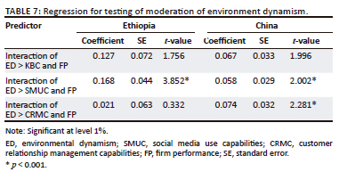 Furthermore, as suggested KBC impacts positively and enhances the firm performance. However, the results are contrary to these hypotheses. Knowledge-based capabilities is nonsignificant in Ethiopia and significant in China; thus H4 is significant in China and insignificant in Ethiopia (βEthiopia = 0.061, tEthiopia = 0.234, βChina = 0.331, tChina = 5.253***). The H5 states that SMUC, social skill competency, social media sales intensity, demand articulation and community characteristics positively impact firm performance in both countries. The results are supported by this view (βEthiopia = 0.466, tEthiopia = 11.117***, βChina = 0.388, tChina = 7.244***). Finally, H6 states that CRMC has a statistically substantial influence impact on firm performance in the context of Ethiopia and China. The results reveal that CRMC has no impact on firm performance in both countries (βEthiopia = (0.003), tEthiopia = 0.551, βChina = 0.061, tChina = 1.058) (see Table 5).