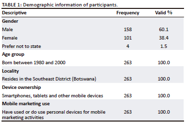 All the participants for this research were millennials residing in the South-East district of Botswana. In line with the national statistics, all the participants owned a smart personal device to potentially engage in MM for banking services (Statistics Botswana, 2019). The target population gender mix in the district is balanced with 52.3% males and 47.7% females, with female-led households that constitute only 43.5% of the users of computers and mobile cellular devices. The analysis results are displayed in Table 1.