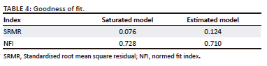 Fit indices assess the fit between the hypothesised model and data from a set of measurement items (the observed variables) (Maydeu-Olivares et al., 2017). Alavi et al. (2020) state that the use of multiple fit indices provides a more holistic view of the goodness of fit. Hair et al. (2006) suggest that at least two indices, namely incremental and absolute fit indices should be examined from the analysis results. From the present study analysis results, the normed fit index (NFI) (incremental) and the standardised root mean square residual (SRMR) (absolute) were ascertained. The values are displayed in Table 4. According to Hayashi et al. (2011), SRMR values of 0.08 or less are considered to indicate a good fit, with NFI in the range of 0-1. Judging from the analysis results, the structural research model exhibited satisfactory goodness of fit to observed data because all the fit indices were within the recommended cut-off values of model fit (Byrne, 2001).
