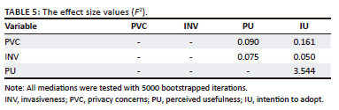 If the analysis results contain some collinearity problems, the results could be biased and end up with a compromised structural model (Risher et al. 2019). The researchers, therefore, first verified the absence of collinearity possibilities and determined the model's predictive power and the accuracy of exogenous variables before interpreting the hypothesised relationships (Hair et al., 2019). To achieve that, the degree of collinearity between PVC, INV and PU was assessed using the variance inflation factor (VIF). All the VIF figures for the final model were within the acceptable range. According to Daoud (2017) and Robinson and Schumacker (2009), a variance inflation factor (VIF) value of 5 or above indicates a collinearity problem. For the present study, all the VIF values were below 5.