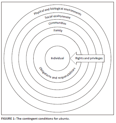 Figure 1 shows how the notion of responsibility is embedded in ubuntu. It reflects the traditions, social rules, principles and norms of ubuntu that affect an African. They are the multiple conditions necessary for ubuntu to emerge as a mechanism and generate outcomes such as compassion and humanitarianism. These conditions can sanction individual action that is socially desirable and also block undesirable action. The social environment, in particular, houses mechanisms to affect the exploitation of the physical and biological environments, and the emergence of ubuntu. Every individual has the potential to experience ubuntu. However, individuals who acquire significant rights, privileges, obligations and responsibilities, such as strategic decision-makers or political leaders, will have a greater potential to experience the generation of ubuntu. As rights and privileges ebb and flow, the extent of ubuntu can also change.