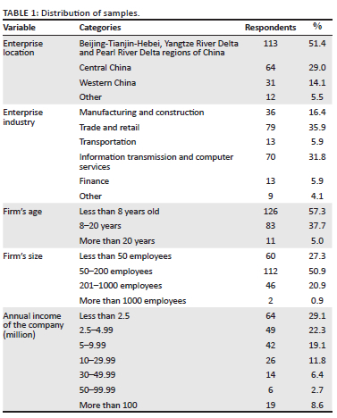 The detailed breakdown of respondents in the survey is as follows: In terms of geographic location, 51.3% of the sample was collected from the Beijing-Tianjin-Hebei, Yangtze River Delta and Pearl River Delta regions of China, 29.0% from Central China, and 14.0% from Western China. Regarding years of establishment, 126 enterprises (57.3%) were less than 8 years old, 83 enterprises (37.7%) were 8-20 years old, and 11 enterprises (5.0%) were more than 20 years old. In terms of the industry, 16.3% were in manufacturing and construction, 35.9% in trade and retail, 5.9% in transportation, 31.8% in information transmission and computer services and 5.9% in finance. As for the size of enterprises, a significant number of enterprises had 50-200 employees, accounting for 50.9%. In the light of the previous year's revenues, enterprises with less than $30 million in revenue accounted for the majority (82.3%). The sample distribution is presented in Table 1. Therefore, we can claim that the ratio of respondents in this survey closely reflects the national distribution of the population.